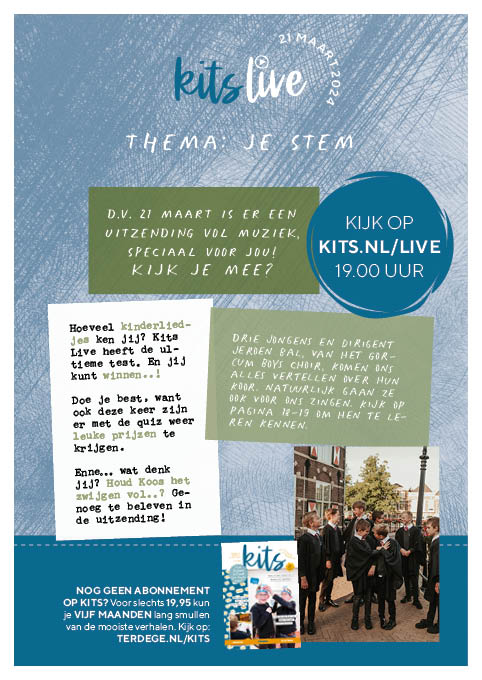 D.V. 21 maart 2024 is er weer een Kits Live uitzending speciaal voor jou, vol muziek! Kijk je mee?